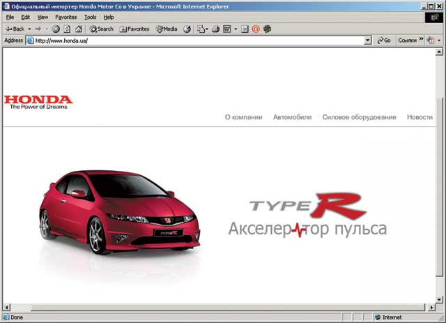 Основная миссия компании Honda – воплощать мечты клиентов и приносить им радость. О том, как японская компания ее выполняет, можно узнать на сайте официального импортера марки «Хонда Украина» – www.honda.ua. Под звуки музыки здесь можно ознакомиться не только с автомобилями Honda, но и практически со всей продукцией компании. Кстати, информация об автомобилях представлена довольно обширно, а для самых популярных моделей в Украине созданы отдельные промосайты, ссылки на которые находятся в левом верхнем углу страницы с выбранной моделью. Раздел «Новости», как и у большинства автомобильных импортеров в Украине, обновляется очень редко. Зато на сайте можно заказать тест-драйв понравившейся модели. Для этого достаточно зайти в раздел с соответствующим названием. А вот найти цены на автомобили, информацию об их покупке в кредит или конфигуратор не удастся. Чтобы узнать стоимость понравившейся модели, нужно зайти в раздел «Дилерская сеть», выбрать в ней свой регион, например Киев, найти адрес сайта дилера Honda в данном регионе и перейти на него. В открывшемся окне ищите нужную информацию. К сожалению, цены есть только на сайтах двух дилеров – Киева и Харькова.