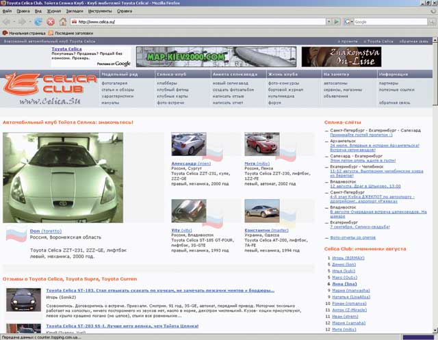Найти столь же полный информационный русскоязычный ресурс, посвященный всего одной модели автомобиля, вряд ли удастся. Возможно, открыть секрет такой популярности Toyota Celica вы сможете, зайдя на сайт www.celica.su (попасть на него можно и по ссылке www.celica.com.ua). Он объединяет владельцев Celica со всего бывшего СССР и других стран мира, среди которых, естественно, много украинцев. Здесь есть подробная информация обо всех поколениях и модификациях модели, технические характеристики, фотографии, инструкции и многое другое. Кстати, посетив «Форум», можно найти и два раздела, посвященных не менее интересным моделям Toyota – MR2 и Supra. Зайдя в меню «Бортовой журнал», можно узнать мнение членов клуба о своих автомобилях и попытаться найти ответ на вопрос «Чому Celica?».