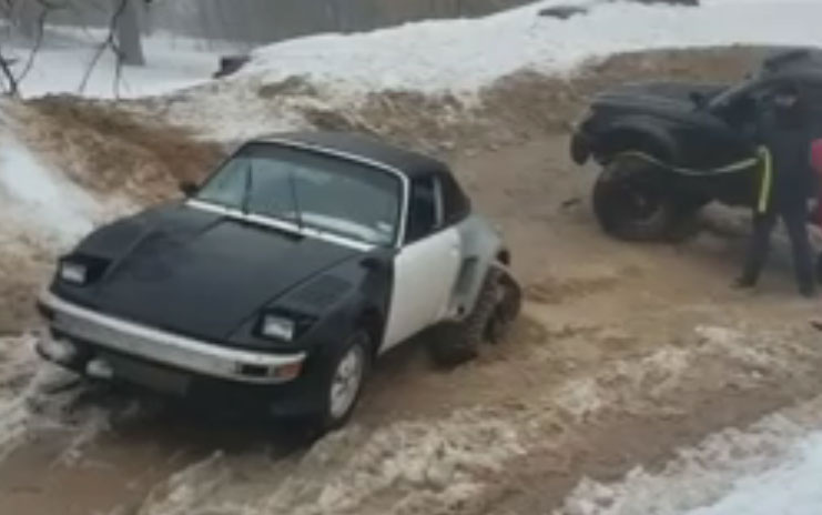 Porsche 911 на гусеницах вытаскивает из грязи пикап Toyota (видео)