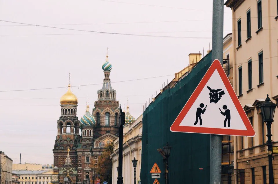 Знак «Осторожно, ловцы покемонов!» засняли на набережной в Санкт-Петербурге. На нем изображены два человека со смартфонами и, собственно, сам покемон.