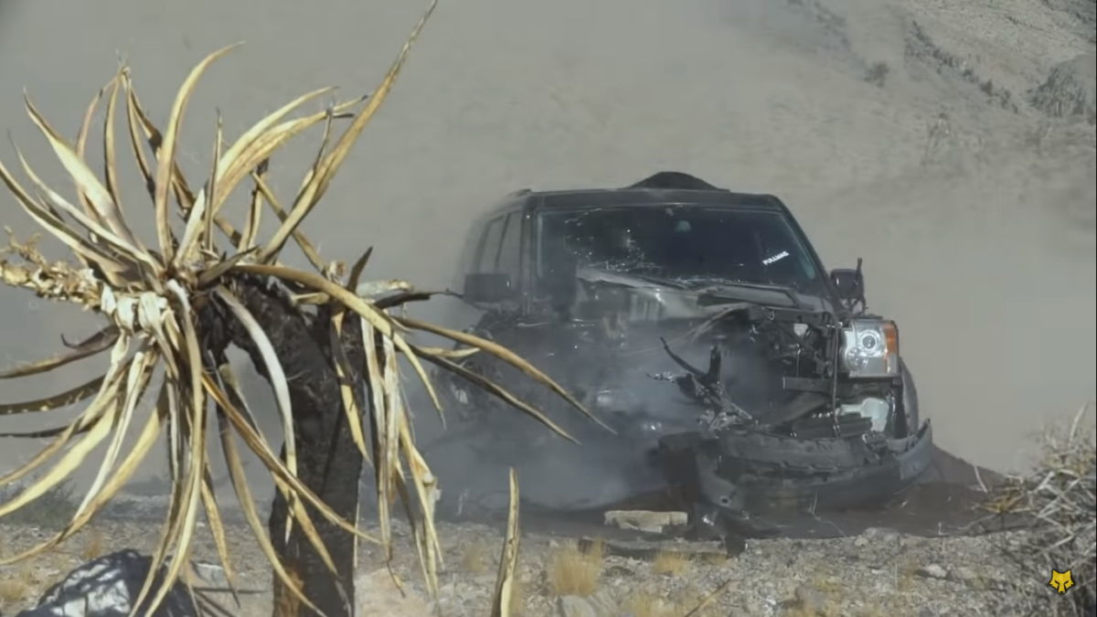 Сначала по внедорожнику пустили снаряд из боевой машины, вследствие чего Дискавери остался без моторного отсека, а затем в дело пошел гранатомет. Однако в этот раз по автомобилю стрелять не стали: чтобы добить Ленд Ровер, достаточно было отвода пороховых газов, выходящих из сопла в казённой части ствола.