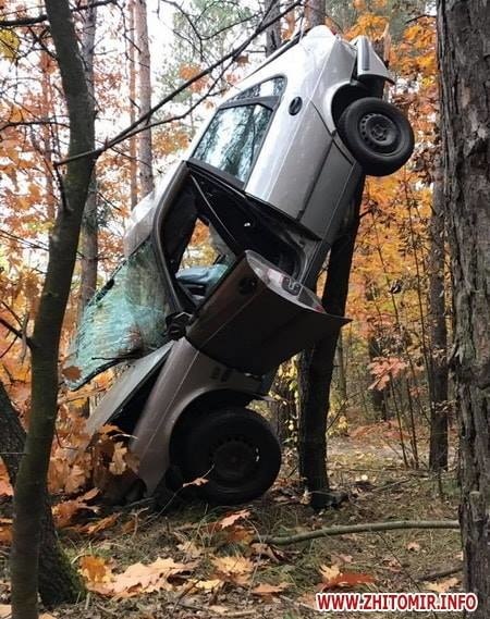 Как сообщает издание Житомир.info, необычное происшествие случилось на Западном шоссе. Водитель Сааба не справился с управлением и вылетел в кювет, а затем автомобиль столкнулся с деревом и замер в необычном положении.