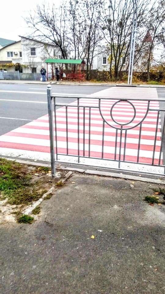 Пешеходные переходы в Киеве могу удивить не только светящейся разметкой, но и неожиданными препятствиями в виде деревьев и заборов.
