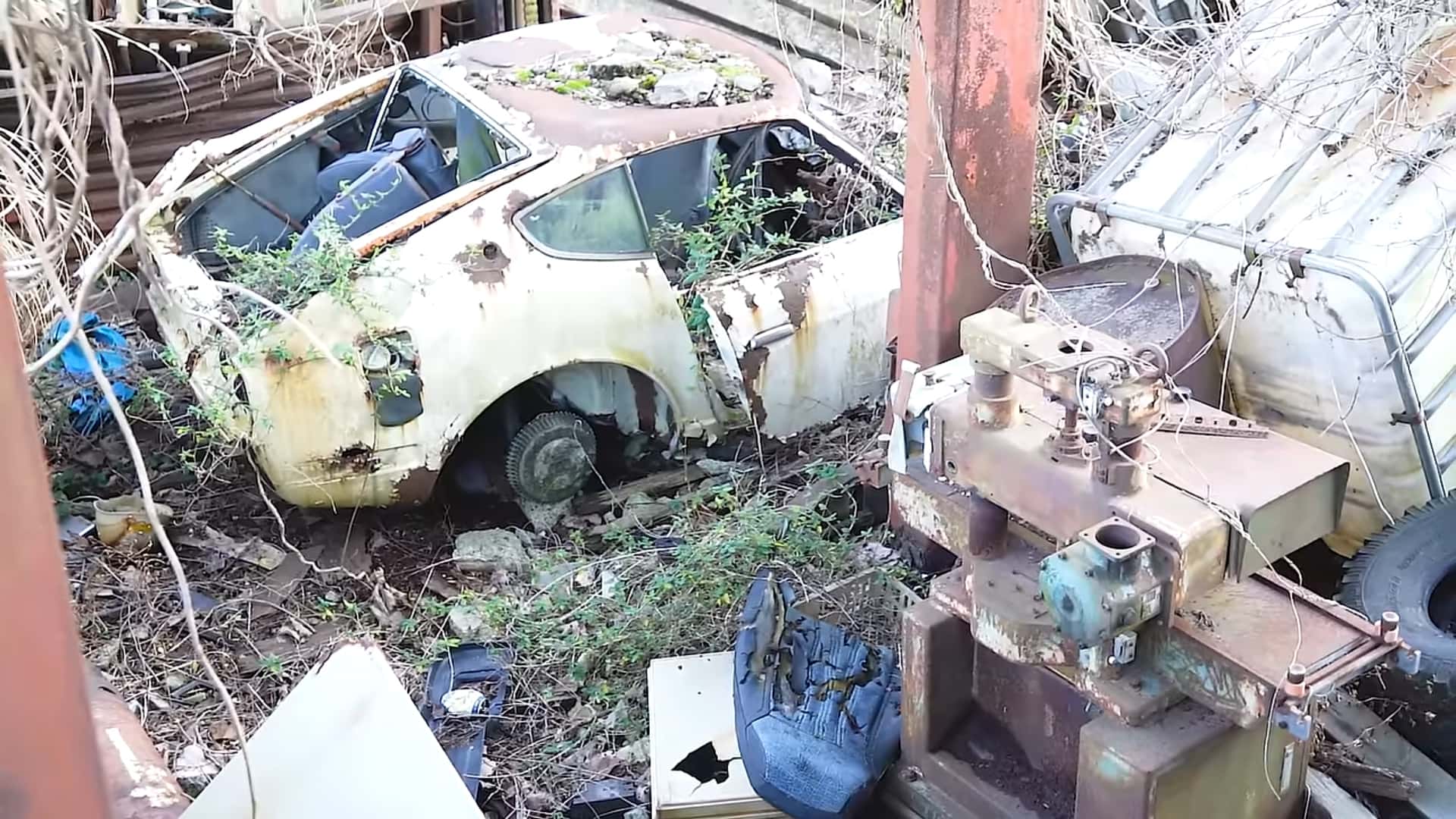 В другом месте он обнаружил остатки того, что могло быть гаражем. Похоже, в какой-то момент крыша здания обрушилась. Именно там и сохранился корпус старого Datsun Z. Под открытым капотом спорткара все еще стоит рядная шестерка. Клапанная крышка отсутствует, обнажая ржавый распредвал, распределительный механизм и клапанные пружины. Выглядит это очень печально.