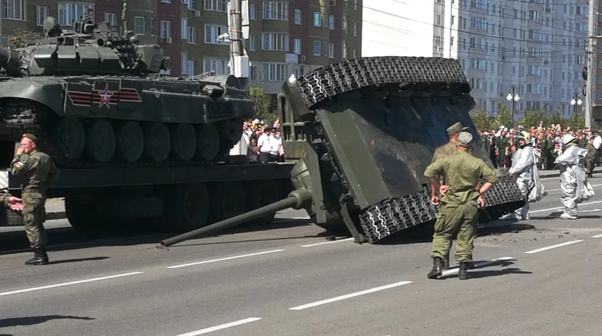В центре Курска перевернули старый танк Т-34. Произошло это после парада, посвященного 75-летию битвы на Курской дуге.