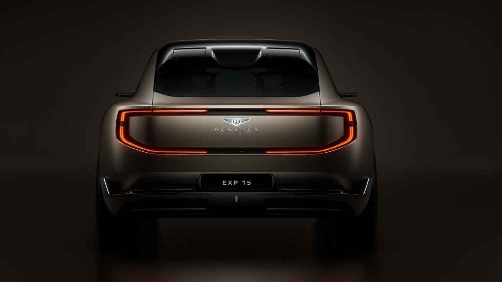 Шоу-кар EXP 15 выглядит очень футуристично. Он представляет собой что-то среднее между купе, седаном и кроссовером. В Bentley новинку характеризуют как седан, заявляя, что это сложный постоянно меняющийся сегмент рынка. При его создании дизайнеры марки черпали вдохновение в трехместном Speed Six 1930 года. В передней части электромобиля доминирует массивная заглушка, которая имитирует решетку радиатора и оснащена особой подсветкой. Также можно отметить вертикальные фары, новую крылатую эмблему Bentley и подсвеченный орнамент на капоте.