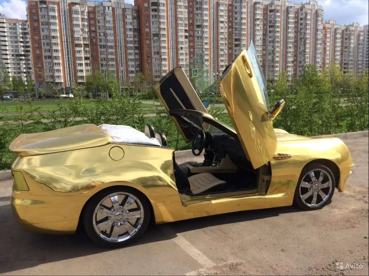 Пару круглых поднимающихся вверх передних фар заменили штатной круглой оптикой, заимствованной, по всей вероятности, у одного из автомобилей Mercedes-Benz. Линией капота и формой «носа» родстер напоминает болиды Формулы-1. Кузов автомобиля покрыли дешевой золотой пленкой, но ситуацию спасают хромированные колесные диски и поднимающиеся вверх ламбо-двери.