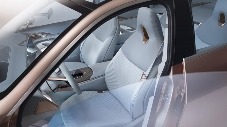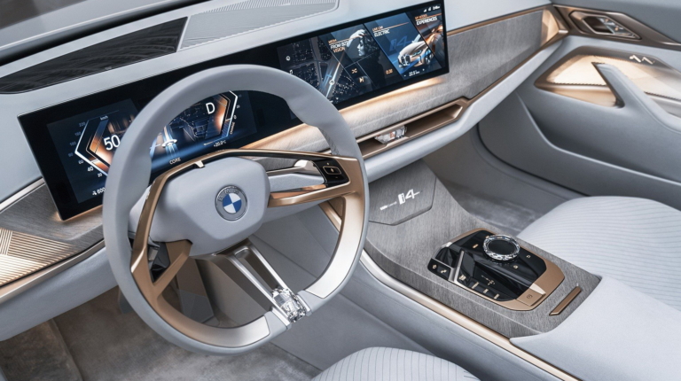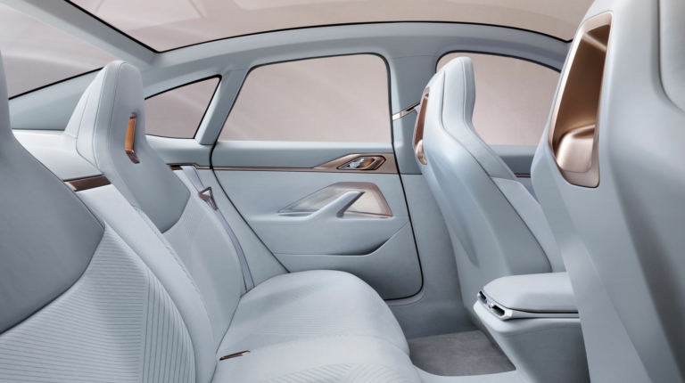 Салон модели невероятно футуристичен и отделан светлой кожей, которая сочетается с элементами из золотой бронзы. Наиболее заметной деталью является изогнутый дисплей, который объединяет в себе цифровую приборную панель и мультимедийную систему. Он оснащен антибликовым стеклом, что позволяет четко видеть экран при любых погодных условиях. Также в оснащение салона входят сидения с функцией памяти. Отдельный акцент производитель сделал на специальном звуковом профиле i4, который был разработан всемирно известным композитором Хансом Циммером. Система будет издавать различные звуки в зависимости от режима вождения, которых у электромобиля целых три: Core, Sport и Efficient.