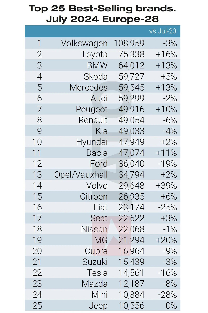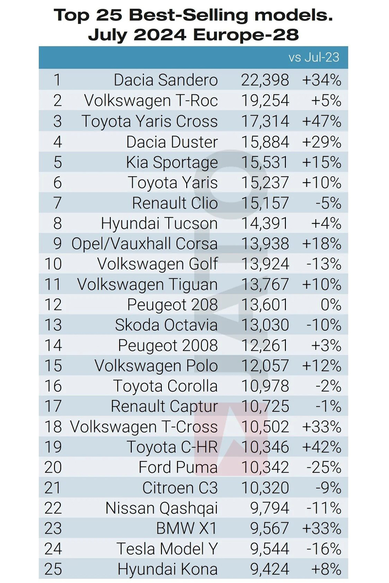 Cамым востребованным автомобилем июля в Европе стала Dacia Sandero, которых зарегистрировали 22400 экземпляра (+34%). Это более чем на 3 тысячи больше, чем у Volkswagen T-Roc, занявшего второе место в рейтинге. Десять самых продаваемых автомобилей в июле состояли из пяти внедорожников и пяти хэтчбеков.
