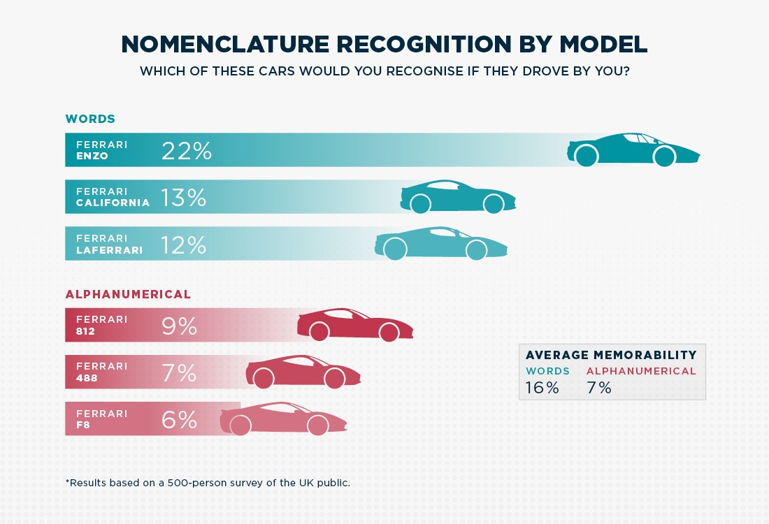 Если говорить о моделях внутри бренда, то самыми запоминающимися оказались автомобили Феррари, а именно Enzo, LaFerrari и California. Названия моделей, состоящие из цифр и букв, такие как 812, 488 и F8 оказались в конце длинного списка.