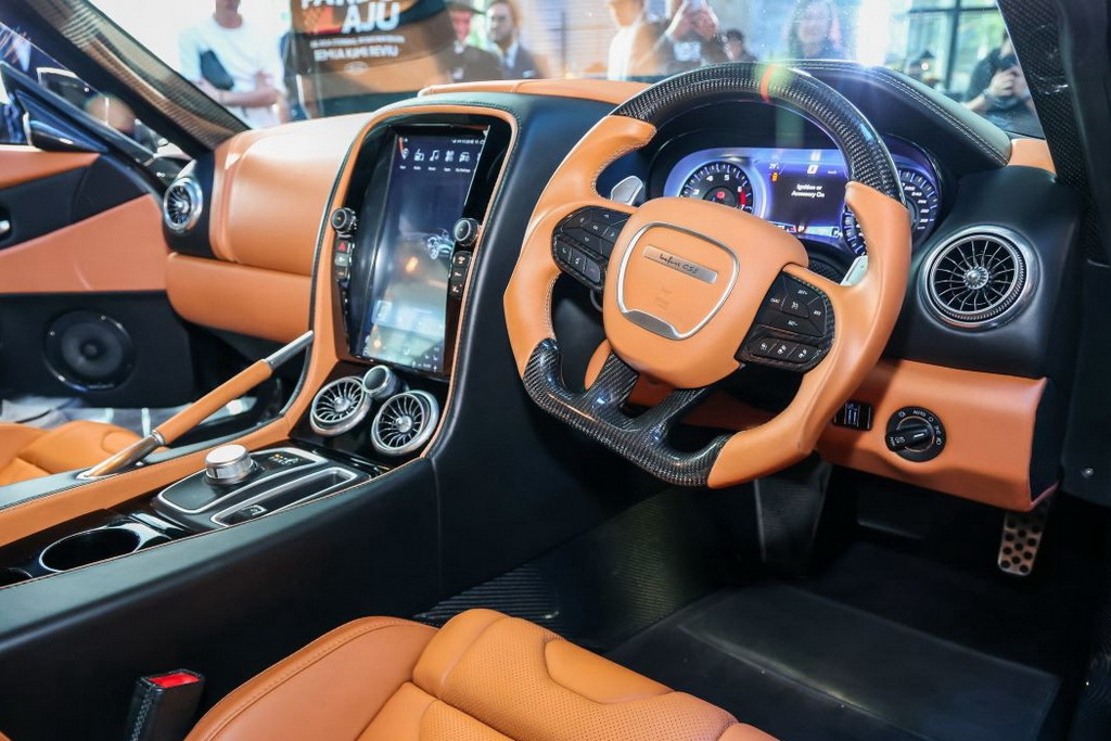 В салоне можно обнаружить аналоговую шкалу приборов, спортивным руль с отделкой из кожи и карбоновыми вставками, а также два ковшеобразных кресла Recaro с электрорегулировкой и кожаной отделкой. На центральной консоли над дефлекторами климат-контроля расположен вертикальный 13,6-дюймовый экран информационно-развлекательной системы. В комплектацию входят современные системы помощи водителю и смарт-метка, позволяющая владельцу определить местоположение автомобиля через GPS.