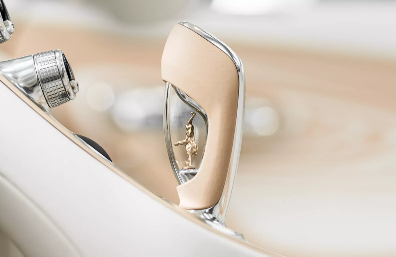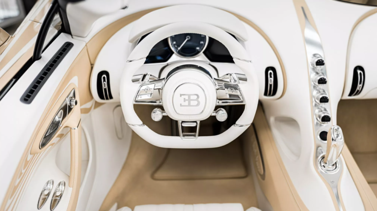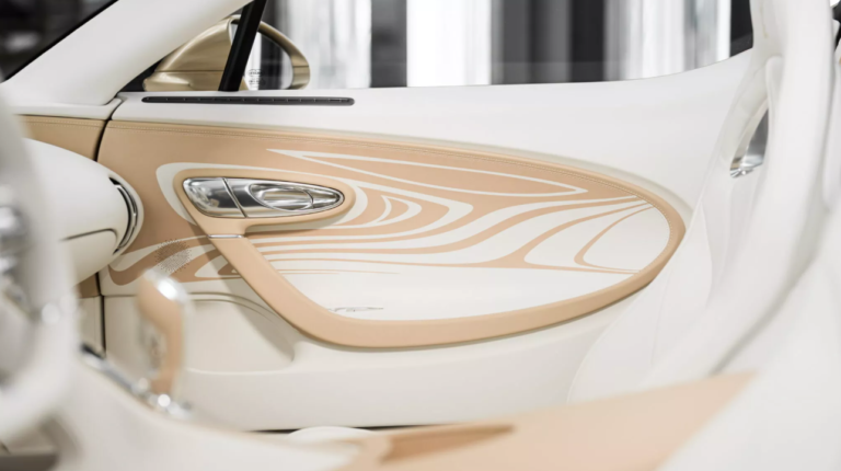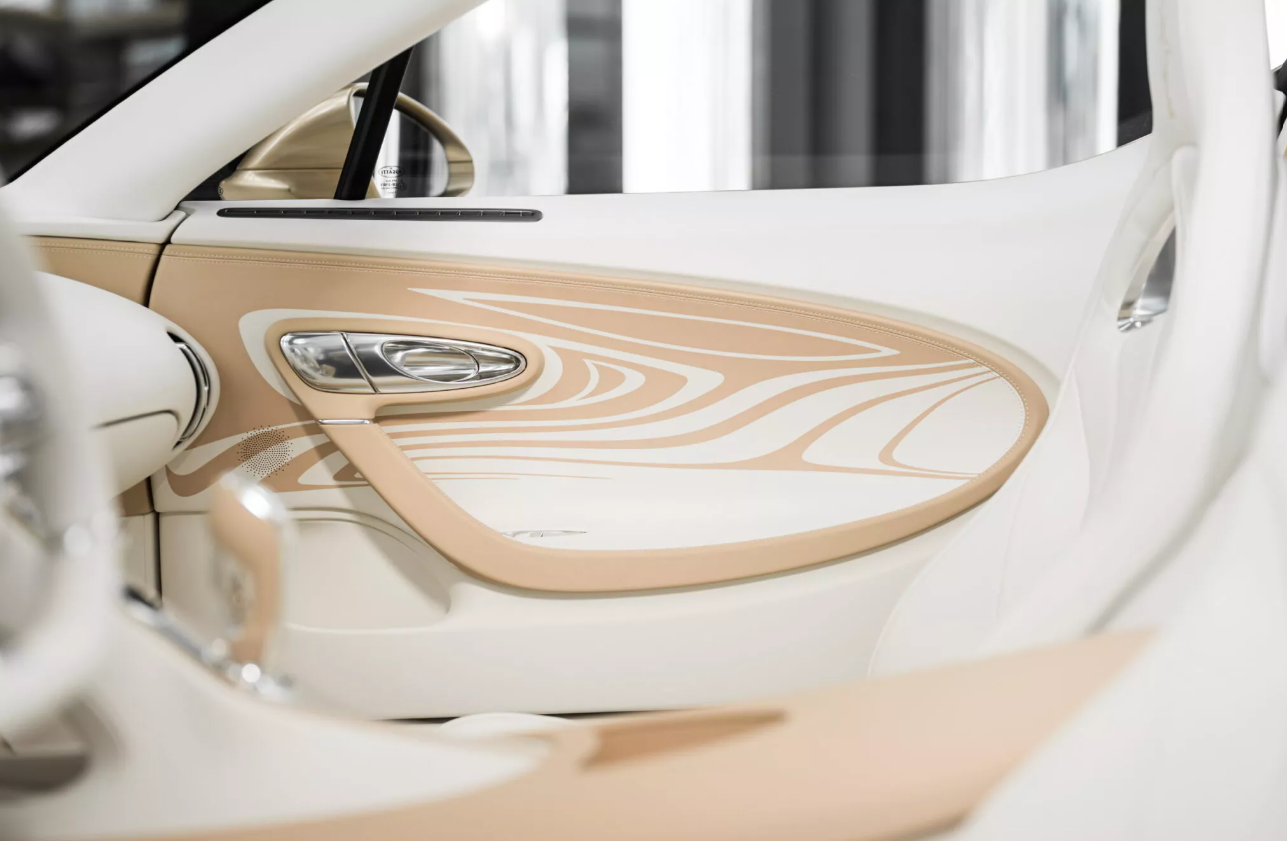 Салон кабриолета отделан кожей белого цвета, которая контрастирует с теплыми золотистыми вставками. Есть фоновая подсветка и полированные алюминиевые акценты, которые придают салону ту же многослойность, которая присутствует в окрасе кузова. Рычаг переключения передач украшает скульптура Рембрандта Бугатти «Танцующий слон», аналогичная вышивка присутствует на подголовниках сидений. Также изображение слона есть на крыльях авто. Кроме того, на центральном тоннеле, крышке двигателя и под активным задним антикрылом присутствует подпись «La Perle Rare».