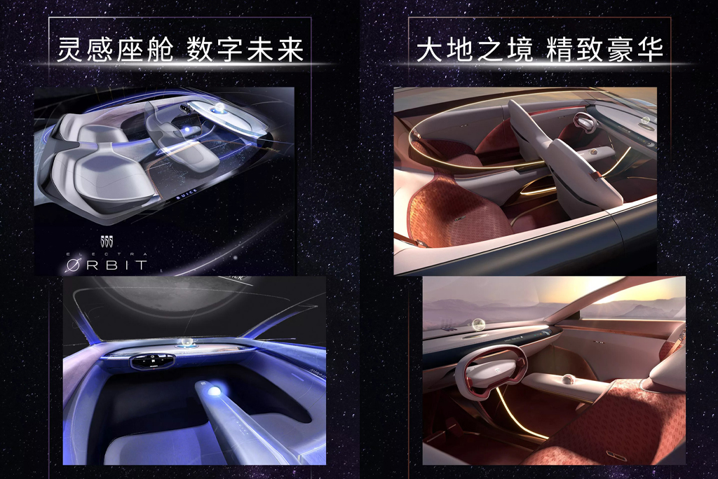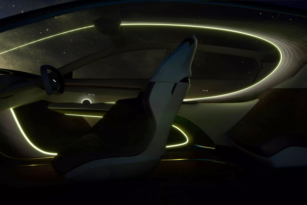 На рендерах интерьера видны четыре отдельных сиденья, разделенных центральной перекладиной, проходящей от передней к задней части, а широкая цифровая приборная панель, которая, по-видимому, состоит из одного тонкого цифрового экрана, протянулась между передними стойками. Сфера на центральной консоли, предположительно, призвана управлять системами привода и инфо-развлекательной системой автомобиля, а под лобовым стеклом парит голографический глобус.