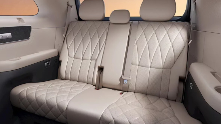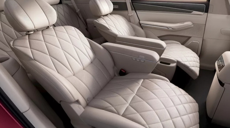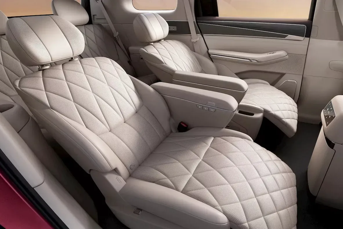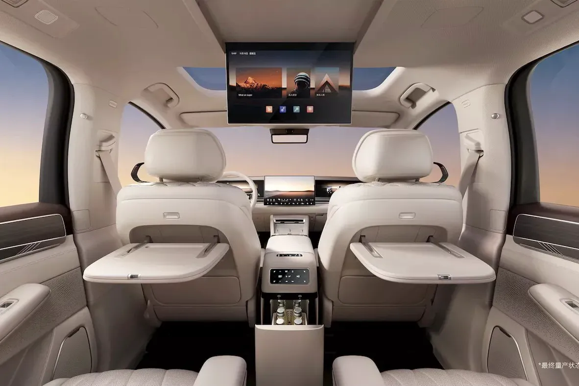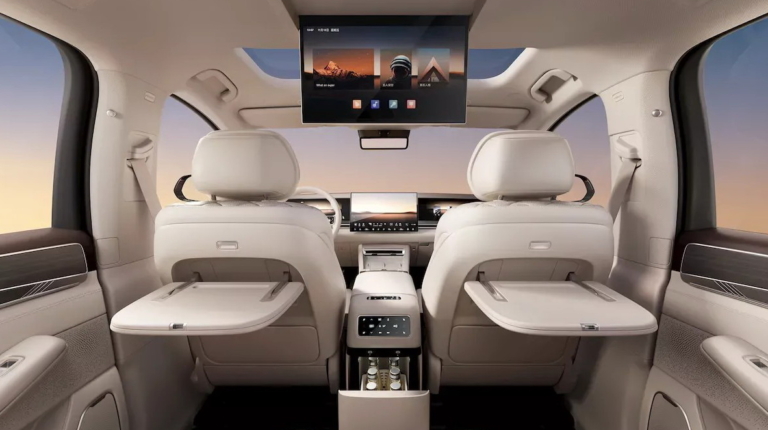 В салоне представлена компоновка сидений 2+2+3 и все возможные элементы роскоши. Здесь есть большой центральный информационно-развлекательный дисплей, а также отдельные экраны для водителя и пассажира, беспроводные зарядные устройства для телефонов, холодильник и откидной экран для задних пассажиров.