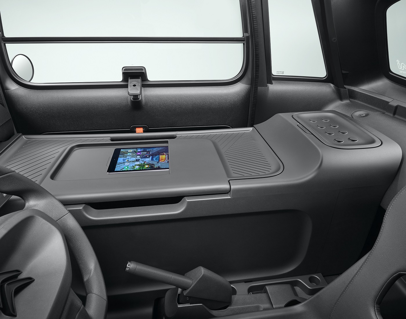 – Модульная полка служит крышкой бокса и способна выдержать вес до 40 кг, а ее верхняя часть приспособлена для создания настоящего «мобильного офиса». Так, в полке сделан вырез под формат А4 для размещения различных документов: бланки доставки, книга заказов, электронный планшет. Полка регулируется: она может сдвигаться ближе к водителю – для лучшего доступа к грузовому отсеку при погрузке/выгрузке, либо сдвигаться к двери – для того, чтобы водителю можно было легче добраться до содержимого ящика прямо со своего сиденья. Кроме того, эту полку можно вовсе снять, что позволяет перевозить высокие предметы и грузы.