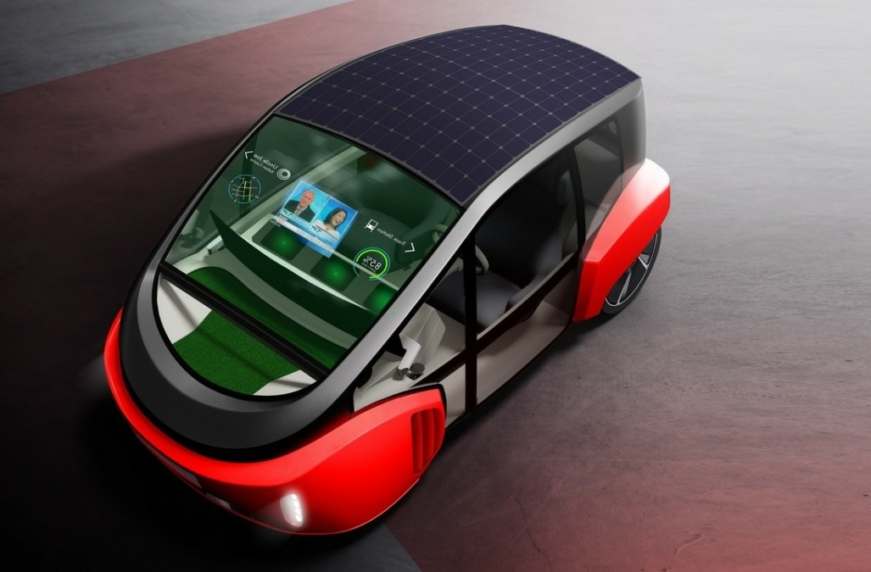 Беспилотный автомобиль Rinspeed Oasis – компактная городская машина размером чуть больше Smart. И, как и Смарт, она также двухместная. У хетчбэка очень большая площадь остекления. Например, сдвижные двери полностью прозрачные.