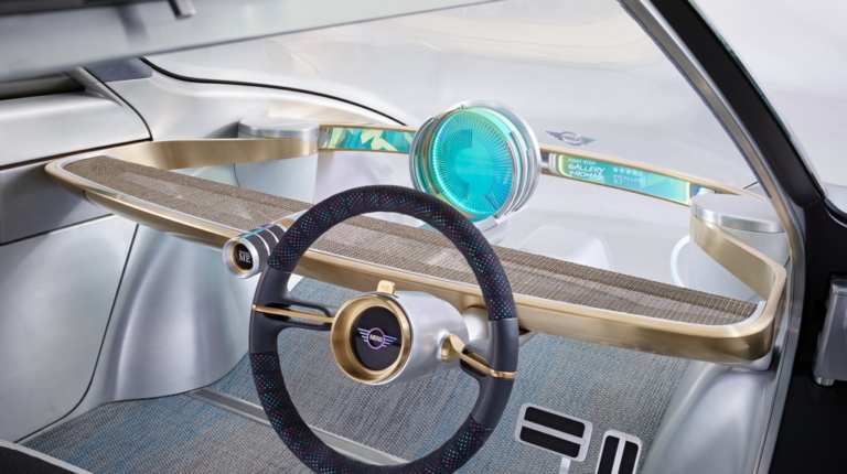 В будущем, где автомобили все чаще используются совместно, возникает необходимость в создании более износостойкого салона. Помимо современных материалов, таких как переработанный пластик и алюминий, присутствующих в конструкции напольной части автомобиля, дизайнеры интерьера Mini использовали необычные решения в виде латуни, базальта и целлюлозы. Информационная панель с небольшим возвышением для рулевого колеса, а также фирменная приборная панель Cooperizer, выполненная из тонкой латунной пластины, являются яркими примерами нестандартного подхода к отделке интерьера. Расположенный прямо за рулевым колесом отсек для хранения вещей выполнен из базальта, в то время как нижняя часть сидений обрамлена переработанным целлюлозным материалом, по структуре схожим с обычной бумагой. Новаторский подход включает в себя и использование патины – специального покрытия, придающего элементам интерьера эксклюзивность и изысканность. Дизайнеры Mini также постарались по максимуму использовать особенности выбранных материалов и их обработки для создания особых тактильных ощущений при соприкосновении с деталями интерьера. Отличный пример – сидения, выполненные из Алькантары и искусное сочетание дерева и кожи в отделке салона.