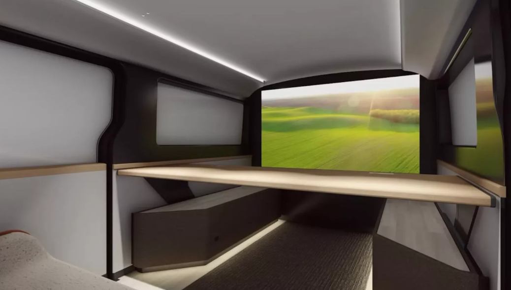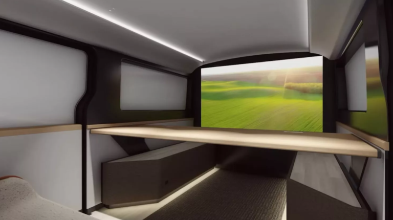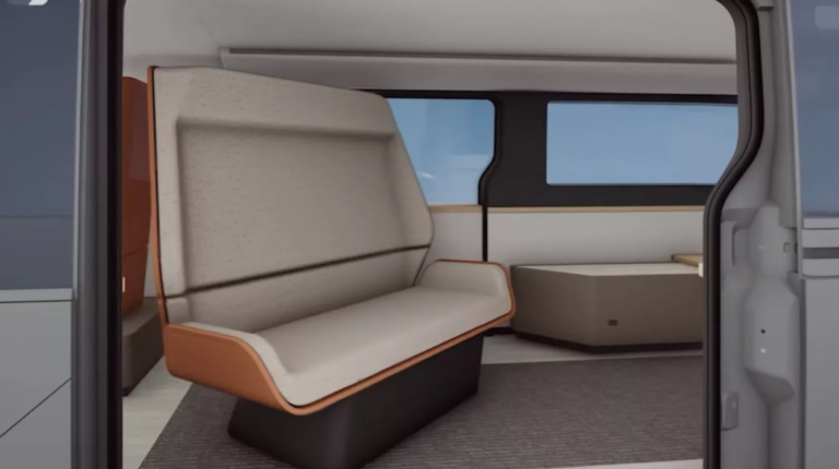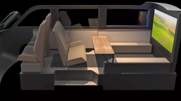 Примечательно, что заднее стекло у электрокара отсутствует. В компании это объясняют тем, что минивэн на максимум оснащен разными датчиками и камерами, которые помогают контролировать ситуацию на дороге. Салон LDK+ просторный и комфортный. В Sharp его назвали «гостиной», а все из-за поворотный сидений и 65-дюймового экрана, который идеально подходит для просмотра фильмов или организации видеозвонков с близкими.