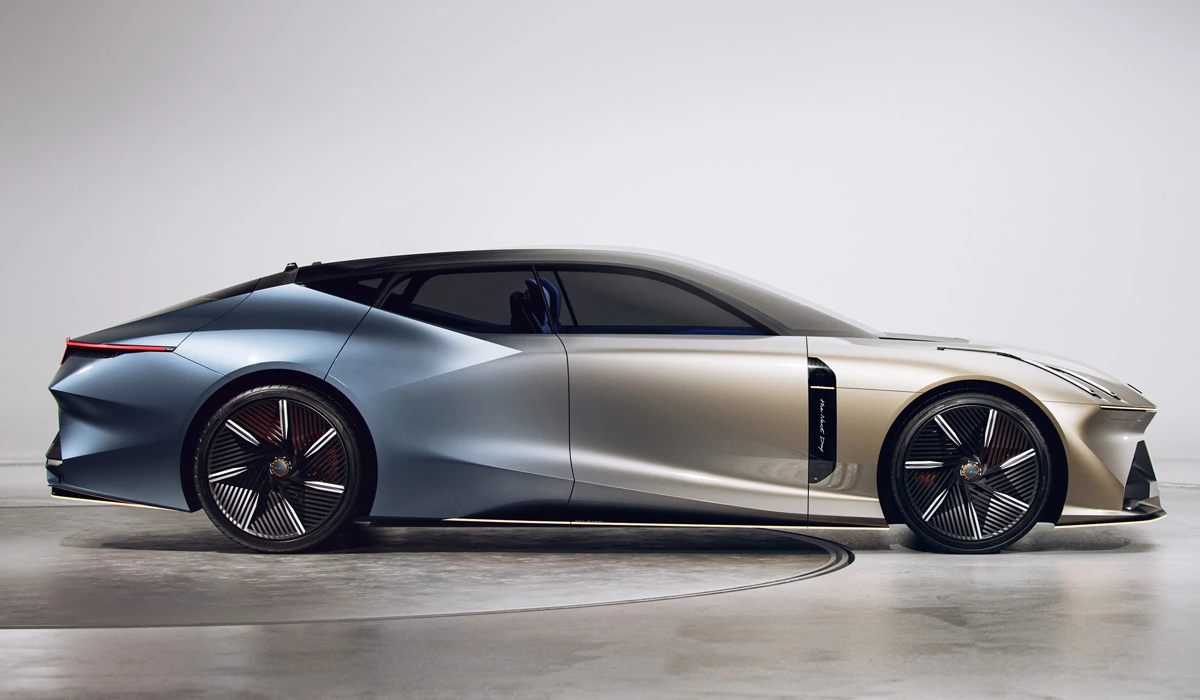 Доступ в четырехместный салон обеспечивают двери-ножницы. Причем задние открываются против движения автомобиля. Интерьер отделан синей джинсовой тканью и декорирован вставками «под дерево». Из оснащения — широкий экран и выдвигающийся штурвал. В режиме автопилота он придвигается к передней панели.