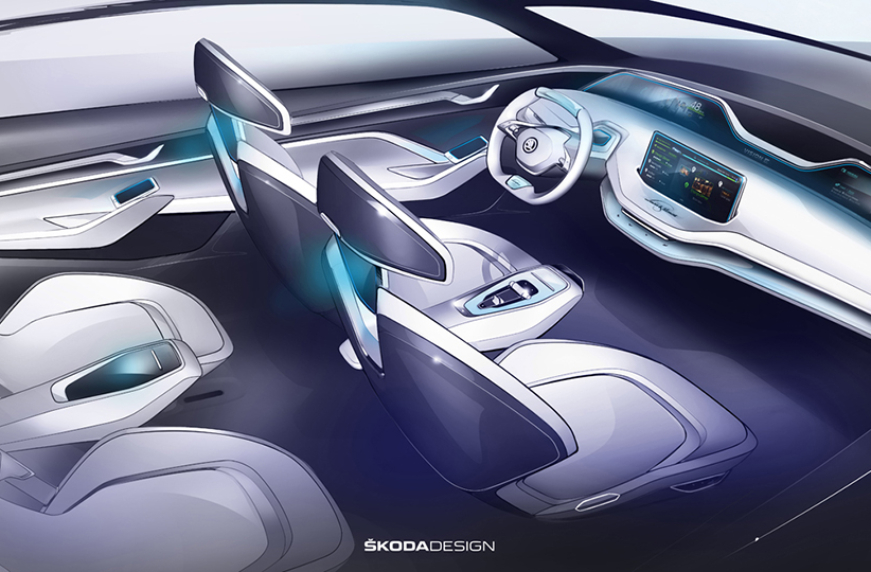 В комментариях к дизайн-скетчам Vision E чешская марка отмечает, что концепт получил вращающиеся сиденья, которые способны поворачиваться на 20 градусов.