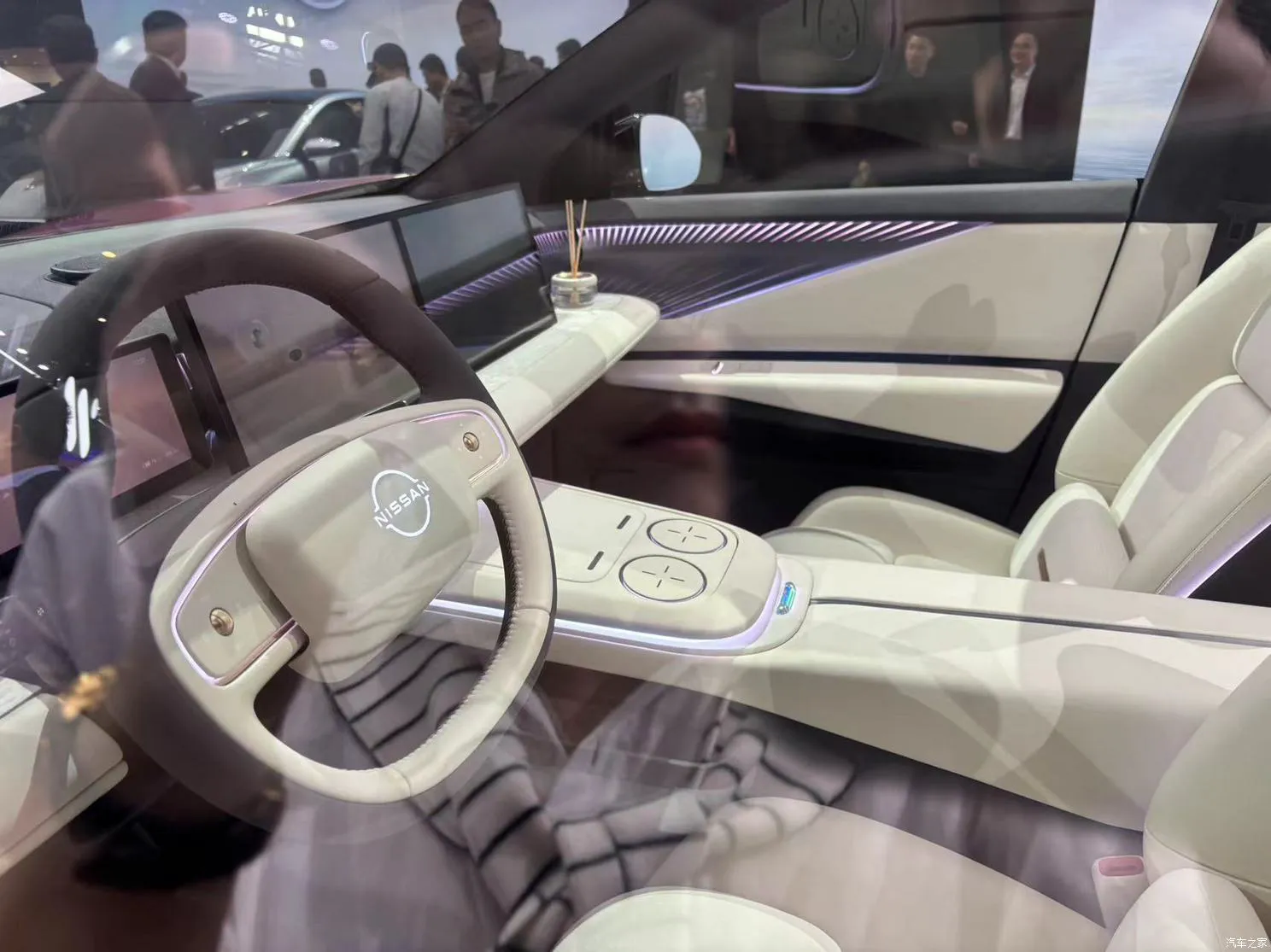 Внутри Nissan Epic выглядит как обычный серийный автомобиль: цифровая панель приборов, большой центральный дисплей и минимум кнопок. Центральный подлокотник оформлен в соответствии с концепцией «упрощенная сложность». Еще более унылым интерьер делает обычное двухспицевое рулевое колесо.
