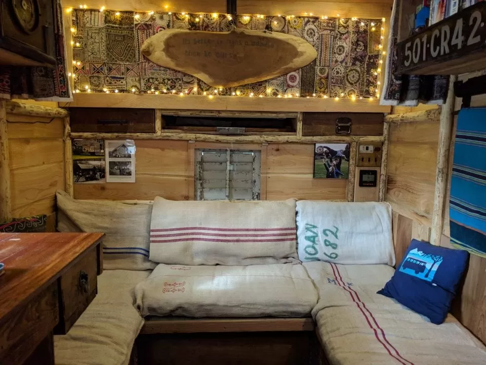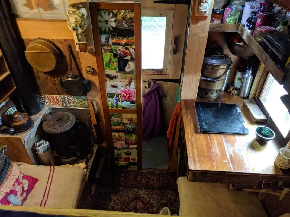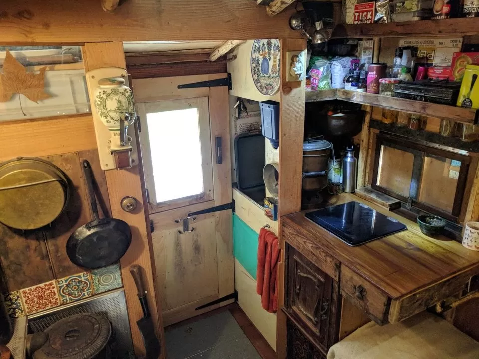 Внутри жилой отсек также отделан натуральным деревом. Назвать интерьер современным нельзя от слова совсем. Он больше напоминает охотничью хижину в лесу. При этом здесь все необходимое для жизни: кухня с комбинированной электро-спиртовой одноконфорочной плитой, антикварная дровяная печь и множество полочек и шкафчиков для хранения кухонной утвари.