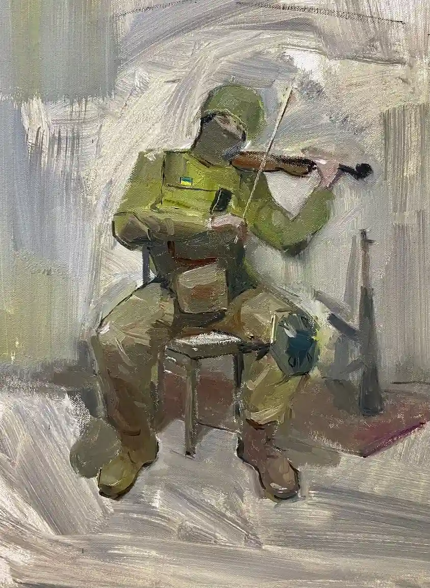 Несколько десятков работ украинских художников продадут на онлайн-платформе Gaga Bid. Среди них и работы Максима. Одна из них — «Звуки мира» — посвящена украинскому воину-скрипачу, радующему своих побратимов игрой на скрипке в перерыве между боями. Начальная стоимость лота — 1500 фунтов стерлингов.
