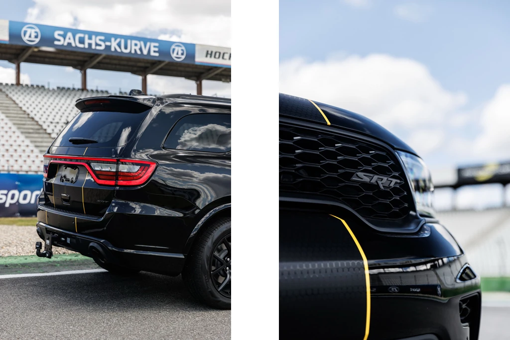 Внедорожник Dodge Durango SRT 392 AlcHEMI отличается от своих собратьев по семейству особой отделкой салона, декоративными элементами и богатой комплектацией. В частности, в список опций вошли желтые суппорта Brembo SRT, декоративные аппликации с рисунком в виде пчелиных сот и желтыми полосами, эмблемы “392” на передних крыльях, 20-дюймовые черные легкосплавные кованные диски SRT с всесезонной резиной Pirelli Scorpion Zero размерностью 295/45, черные выхлопные патрубки, облицовка радиатора Midnight Metallic и символика подразделения SRT.