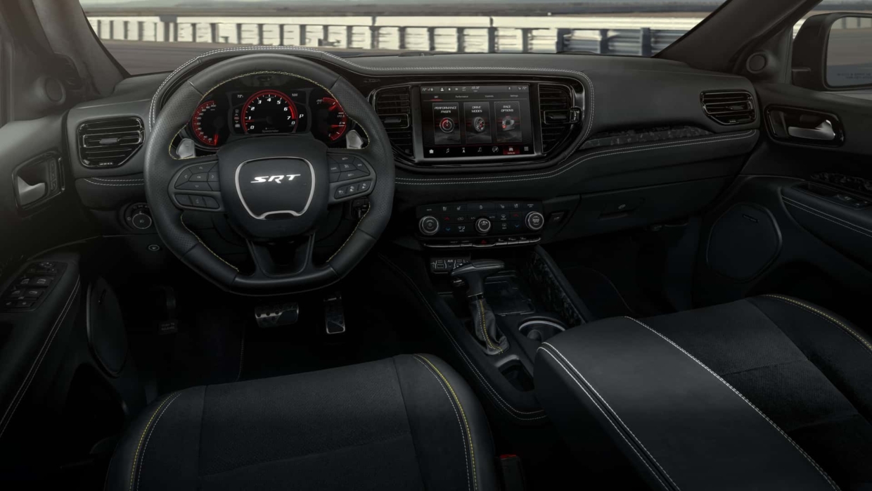 Интерьер особого кроссовера украшен желтыми и серебрянными акцентами. На спинках сидений вышиты логотипы SRT «392». Также белый подсвеченный логотип SRT украшает центральную часть трехспицевого рулевого колеса, обтянутого кожей и замшей. Интерьер декорирован карбоном.