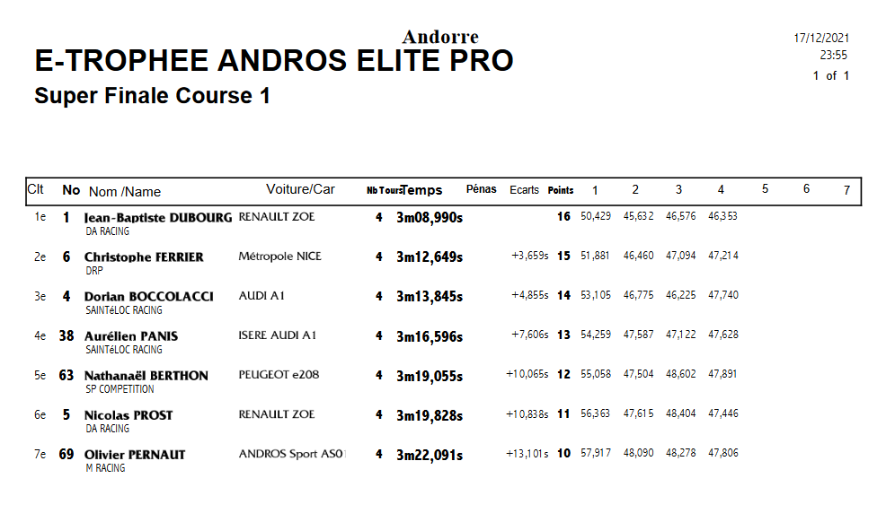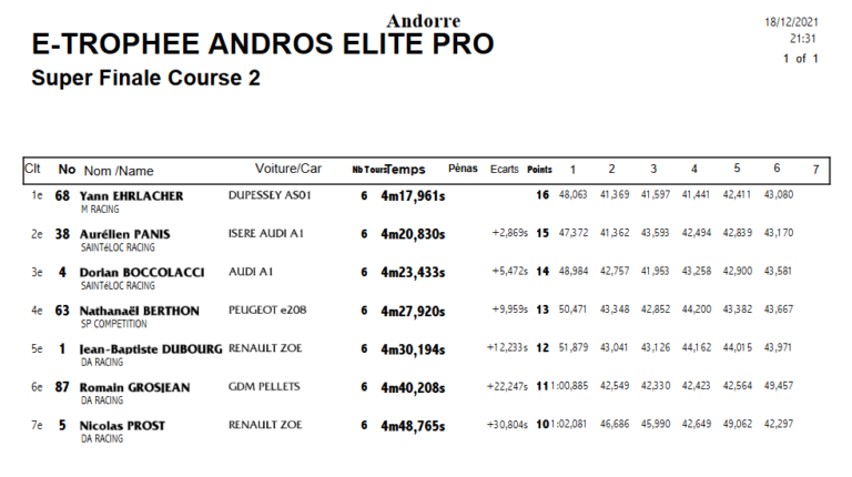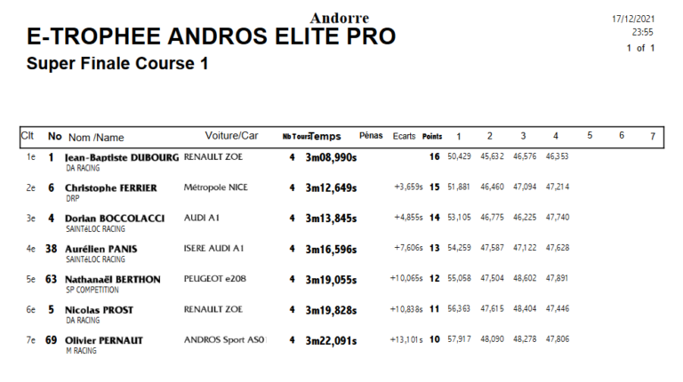 Орельен Панис приступил к заезду Супер Финала с поула. За ним в контактной борьбе Ян Эрлашер сохранил позицию впереди Дориана Бокколаччи и навязал борьбу лидеру заезда. Роман Грожан из GDM Pellets и Николя Прост на Renault Zoe безнадежно отстали с самого начала. Впереди Эрлашер беспощадно атаковал снежные насыпи правой стороной болида Dupessey AS01. Словно отрабатывая маневр, сработавший на третьем круге. Теперь победитель Мировой серии WTCR жестко атаковал уже Audi A1 Орельена Паниса. На этом его болид получил еще большее количество кузовных повреждений, а также лидерство в заезде. На глазах передняя правая сторона болида разрушалась, однако на 6 кругов запаса крепости хватило. Первая победа Эрлашера, оставившая его третьим в сезоне (228 баллов). На один балл меньше у Натанайоля Бертона, который воспользовался стычкой Грожана и Проста и финишировал четвертым. В то же время второе место на этапе позволило ему сравниться по набранным баллам с лидером Жаном-Баптистом Дюбуром – у обоих по 234 поинта. Дюбур удовлетворился лишь пятым местом Супер Финала, но сохранил номинально первую позицию при большем количестве побед – две против одной у Паниса. Отдельно также отметим успех Дориана Бокколаччи. Два подиума гонщика на этапах в Андорре в сумме принесли ему 121 балл – больше кого-либо из главной топ четверки, однако в общей сложности остается отставание в 10 очков от Бертона.