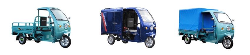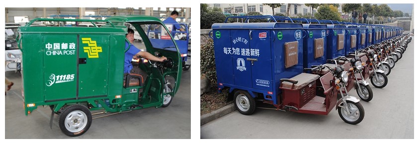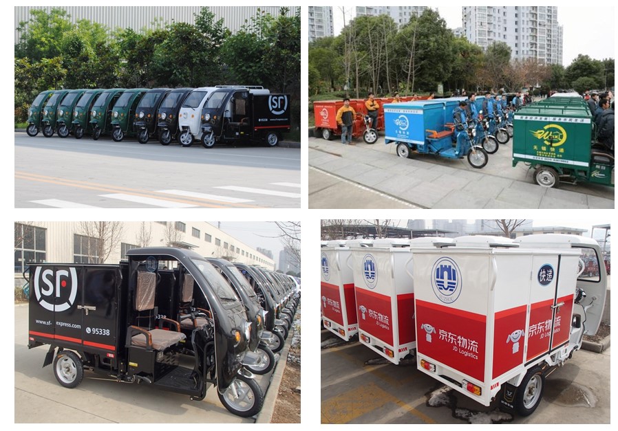 Используются различные модификации моделей – закрытые и открытые кабины, тяжелые и легкие грузовые фургоны, с закрытыми будками, термобудками и даже с рефрижераторами. Трехколесная техника стала оптимальным решением и лучшим выбором в сфере доставки товаров и услуг в городах Китая за последнее десятилетие. Сегодня в Китае на электрические трициклы осуществляют около 90% всех адресных доставок, причем каждый водитель доставляет в среднем 300-360 кг грузов каждый день .