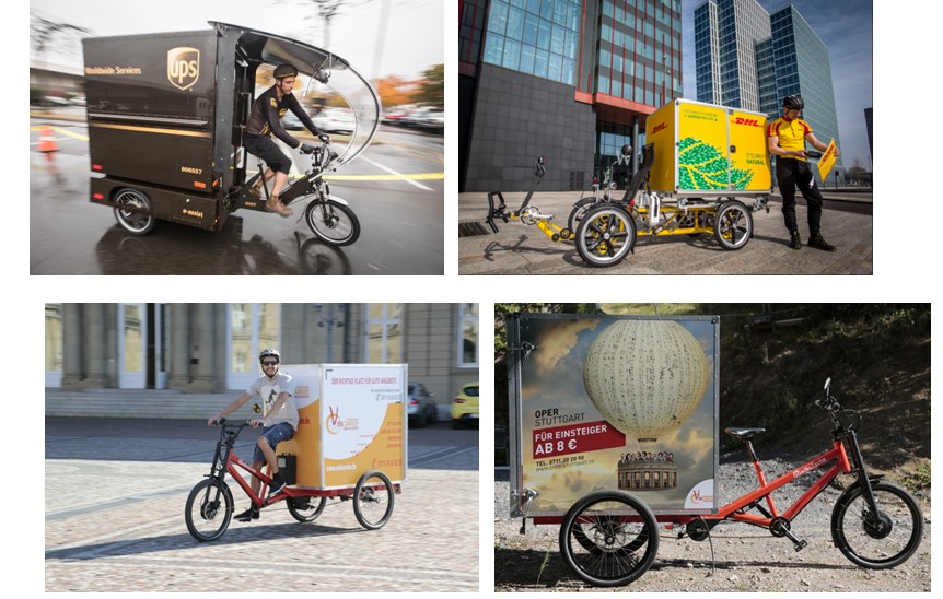 Чтобы максимально использовать потенциал трехколесных транспортных средств, сектор доставки в Германии также экспериментирует с новыми бизнес-моделями и логистическими концепциями: яркими примерами являются инициатива UPS Rolling Laboratory или проект City-Hub и Cubicycle, представленный DHL. Обе компании установили, так называемые микро-склады, которые хранят пакеты в зоне обслуживания электротрицикла.