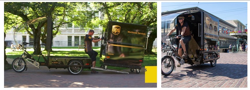 UPS провела полевые испытания электрических трициклов для адресной доставки по району, которые показали, что один электрический трицикл может заменить три обычных грузовика для доставки в день. Замена трех таких грузовиков с дизельным двигателем на электрические грузовые три циклы, позволила бы сократить потребление топлива примерно на 32 литра в день, что не только позволило бы сэкономить на эксплуатационных расходах, но и обеспечило бы экологическую альтернативу, которая могла бы сэкономить до 25,5 тонн выбросов CO 2 в год!