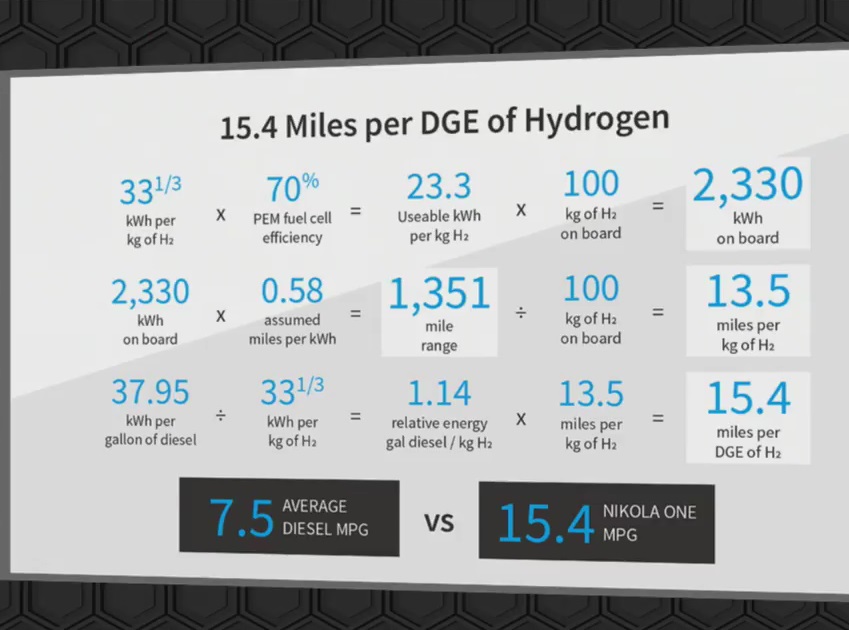 Себестоимость пробега километра на водороде в два раза меньше, чем на дизтопливе. При этом средняя скорость в полтора раза выше. Серийное производство тягача Nikola One должно начаться к 2020 году. К этому времени Nikola Motor собирается построить в США и Канаде свыше 300 водородных заправок.
