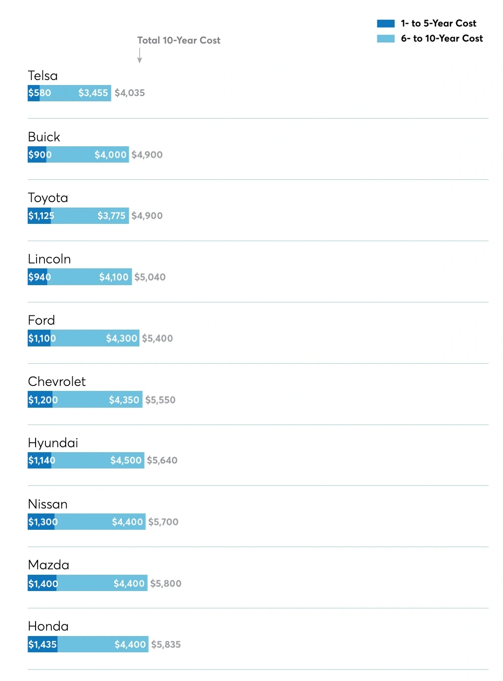 Стоит отметить, что четыре из пяти мест «пятерки» лучших автомобильных марок с наименьшими затратами на ремонт и обслуживание достались «американцам» — Tesla, Buick, Lincoln и Ford.