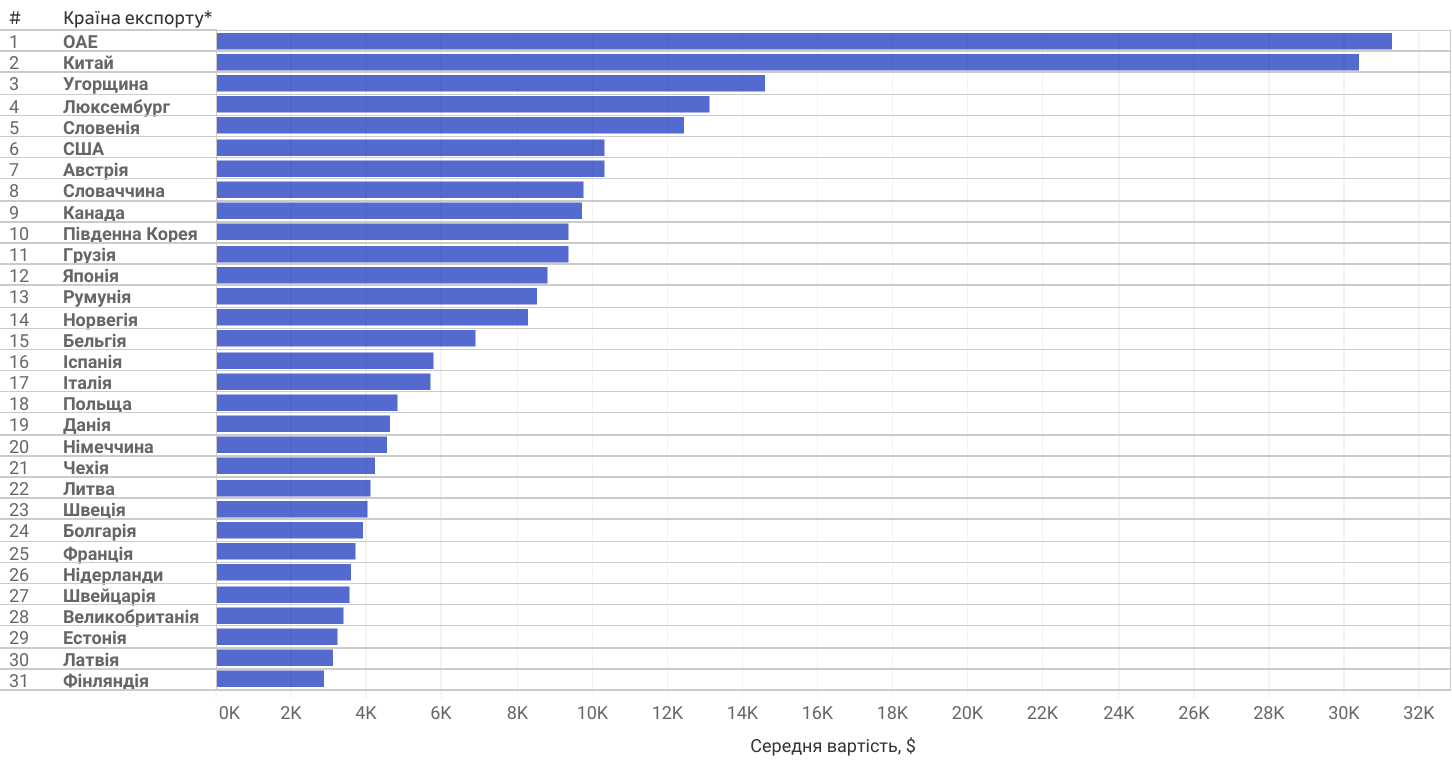 Интересно, что подержанные автомобили из Китая стоили 2,17 млрд грн. Это четвертый результат по итогам шести месяцев, тогда как по количеству самих автомобилей эта страна оказалась на восьмой позиции (1963 ед).