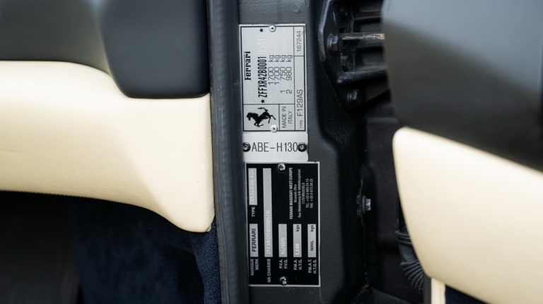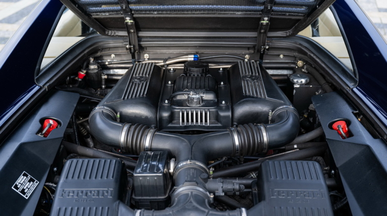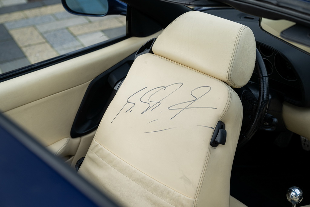 Автомобиль окрашен в синий оттенок Blu Le Mans, а салон выполнен в бежевом цвете Pella Crema. Под капотом располагается 3,5-литровый V8 мощностью 280 л.с., который работает в паре с механической 6-ступенчатой коробкой передач. Интересно, что судьба “родного” мотора, который был первоначально установлен на этом автомобиле, не известна. Есть только информация, что нынешний двигатель был установлен на автомобиле до 2004 года. По неподтвержденной информации, первоначально машина имела форсированный силовой агрегат, в настройках которого принимал участие лично Михаэль Шумахер, а кто и когда его заменил обычным V8 от Ferrari 355 GTS, остается загадкой.
