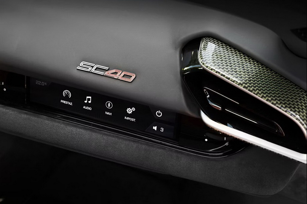 Надпись SC40 рельефно выгравирована на боковой стороне заднего антикрыла, а боковая часть профиля выделяется треугольными карбоновыми акцентами и большими воздухозаборниками интеркулера – современной интерпретацией классических воздуховодов и жалюзи NACA, которые определяли облик F40.