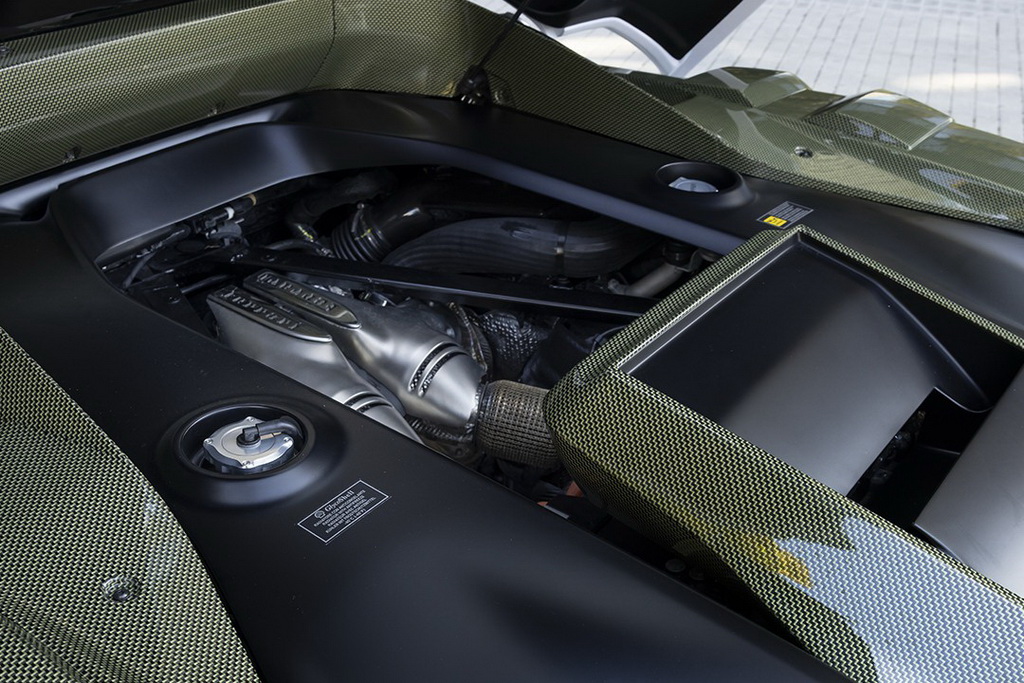 Длинный, низкий нос и короткие задние свесы дополняются высоким фиксированным задним антикрылом, которое создает узнаваемый силуэт. Отсылки к деталям включают тонированные жалюзи Lexan и сетчатую заднюю панель, которая способствует охлаждению мощного турбированного двигателя.