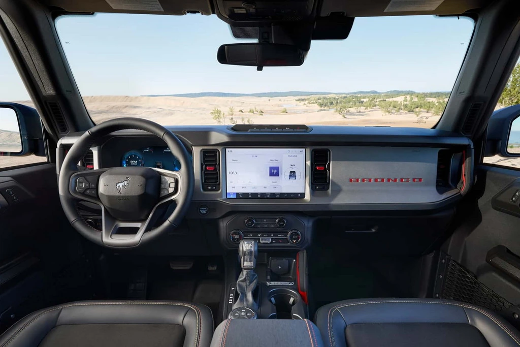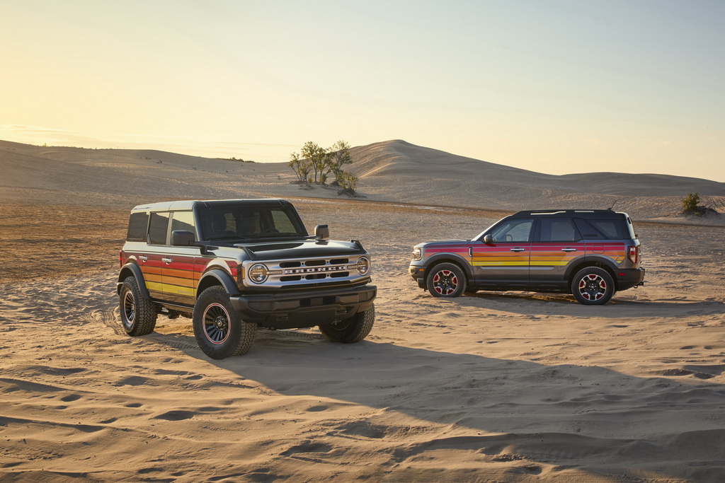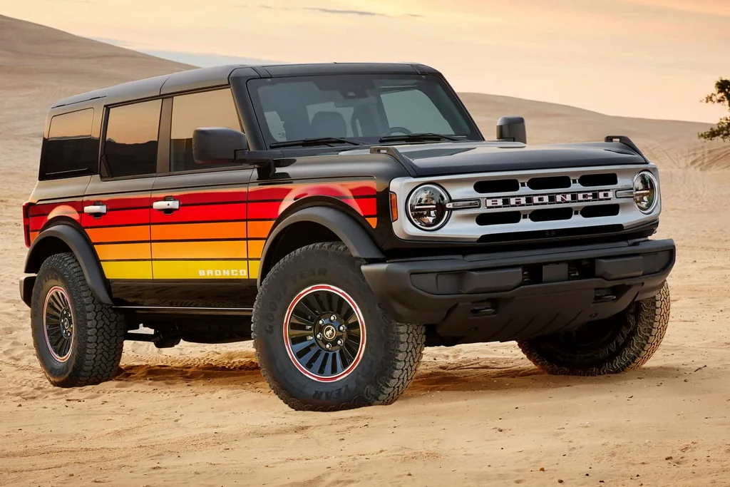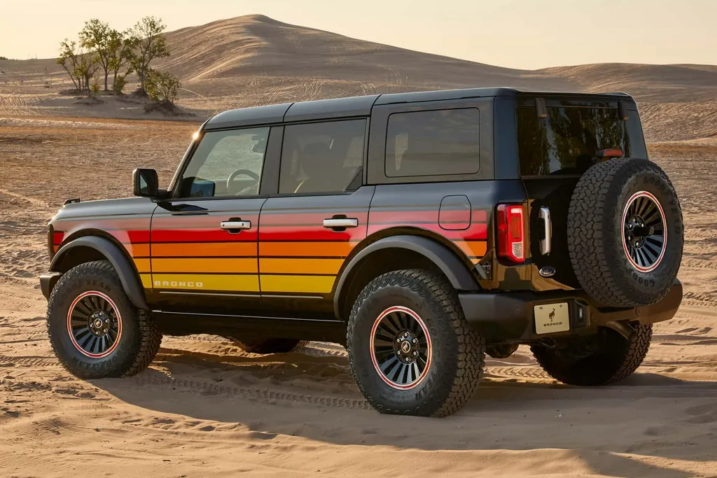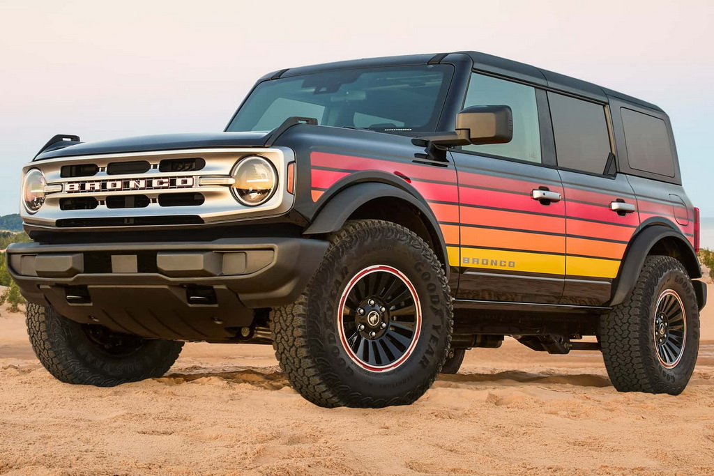 Впервые яркую “градиентную” версию компания подготовила в 2023 году для Ford Bronco Sport. Теперь пришла пора примерить красочную ливрею на “большом брате”. Bronco Free Wheeling получил декоративные аппликации, дверные ручки в цвет кузова, серебристую облицовку радиатора Iconic Silver с красной надписью Bronco, черные 17-дюймовые стальные колесные диски. Также покупатели могут дополнительно заказать пакет Sasquatch, в который входят черные алюминиевые диски с красной окантовкой по краям. Черная съемная крыша Shadow Black доступна вместе со стандартным мягким верхом и жесткой крышей в цвет кузова.