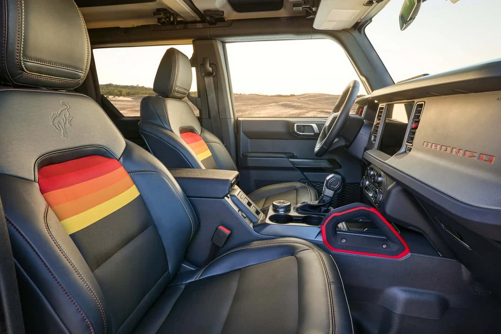 Все внедорожники Bronco Free Wheeling оснащены уникальными сиденьями с сочетанием винила Marine-Grade и тканевой обивки, оформленные в ярких красно-оранжево-желтых цветах, аналогичных внешнему декору. Также для фанов компания подготовила разнообразную сувенирную продукцию в стиле Free Wheeling.