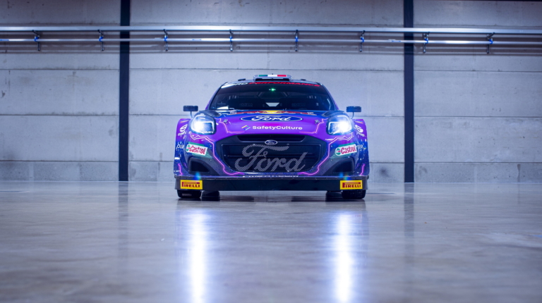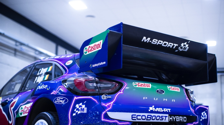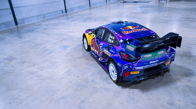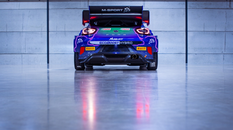 Ford Puma Rally1 получил уникальную ливрею в ярко-синих и фиолетовых тонах, украшенную электрическими разрядами, что указывает на силовую установку кроссовера. Впрочем, это первый электрифицированный ралли-кар в истории американкой марки, который принимает участие в такого рода мероприятиях. Также стоит отметить огромное антикрыло на корме машины и развитый аэродинамический обвес.