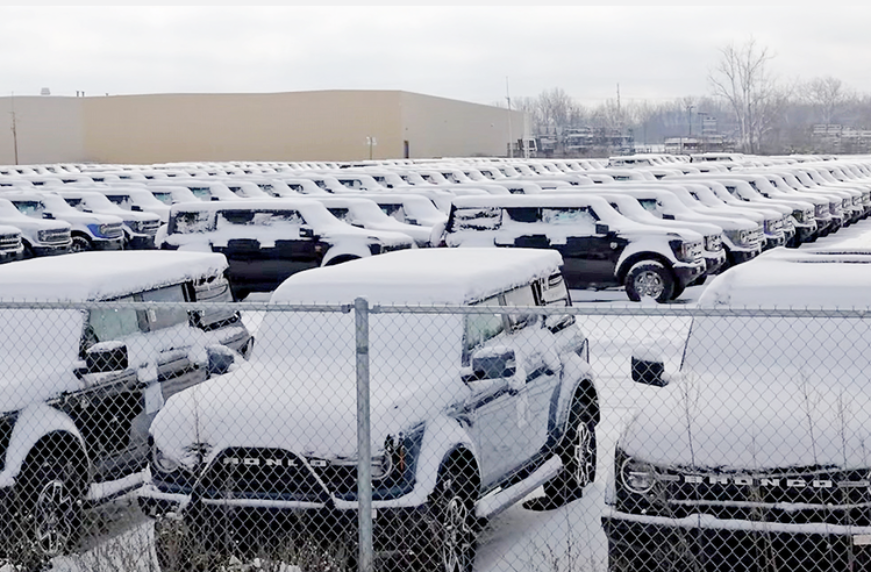Ford Bronco на сегодняшний день является одним из самых востребованных автомобилей. Очередь за ним выстроилась на несколько лет вперед. При этом огромная партия машин находится на открытой стоянке завода в Мичигане (США) и покрывается снегом.
