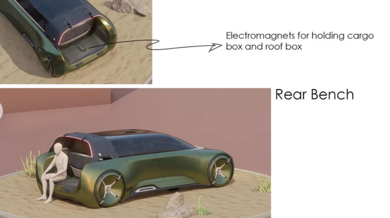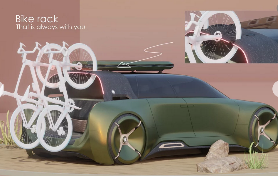 Также это пространство можно использовать для транспортировки грузов. Для этого нужно просто приобрести ящик соответствующего размера и закрепить его на корме. Интересной идеей является и встроенный держатель для велосипеда, который отлично сочетается с компактным багажником на крыше. Его высоту можно регулировать в зависимости от размера груза. Салон электромобиля выглядит не менее оригинально. Он рассчитан на четырех человек. Сиденья могут поворачиваться на 180 градусов и даже превращаться в кровать. Идея очень оригинальная, но воспользуется ли ею Skoda – неизвестно.