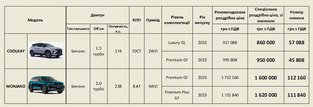Официальный дистрибьютор GEELY в Украине, ТОВ «ГРАНД АВТОМОТИВ», который входит в состав компаний Корпорации «УКРАВТО», объявляет о распродаже наличия GEELY Coolray и GEELY Monjaro 2023 года выпуска с максимальною скидкой до 112 160грн! Акция действует с 8 мая до 31 июля 2024 года, либо до полной распродажи указанных машин (в зависимости от того, что случится раньше) в дилерской сети ТОВ «ГРАНД АВТОМОТИВ». Цены зафиксированы на весь период распродажи! 1