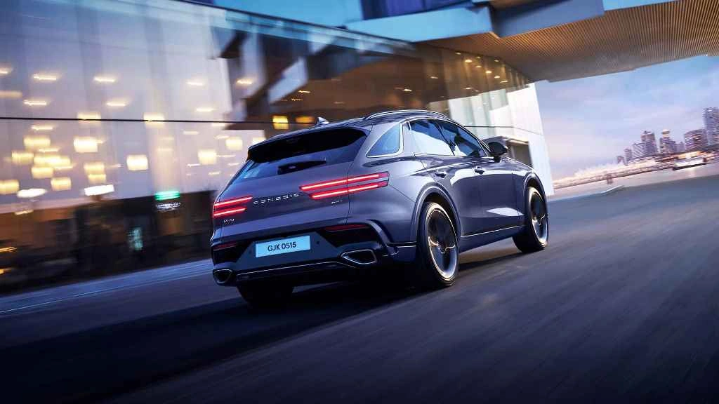 GV70 получил решетку радиатора с двойной сеткой, фары Two-Line с новейшей технологией MLA и новую защитную пластину. Также изменили указатели поворотов на корме, установили новый задний спойлер и иные патрубки выхлопной системы. Ездит авто на 19-дюймовых колесных дисках темно-серебристого цвета.
