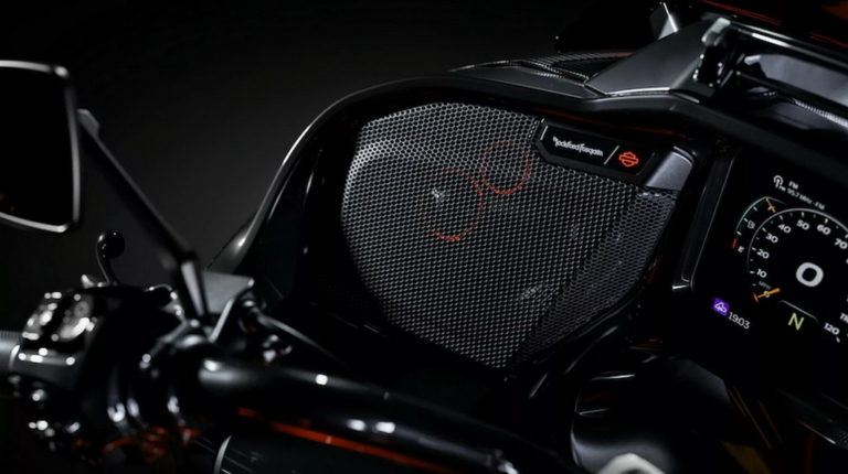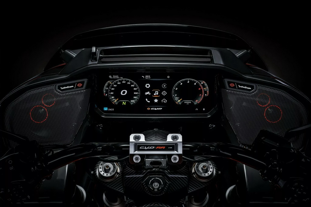 Еще одним достоинством Road Glide RR является высокий ездовой комфорт. Поэтому спереди и сзади на нем установлена полностью регулируемая подвеска Trick Ohlins. В конструкции используется много компонентов из углеродного волокна. А за музыкальное сопровождение в путешествии отвечает аудиосистема Rockford Fosgate.