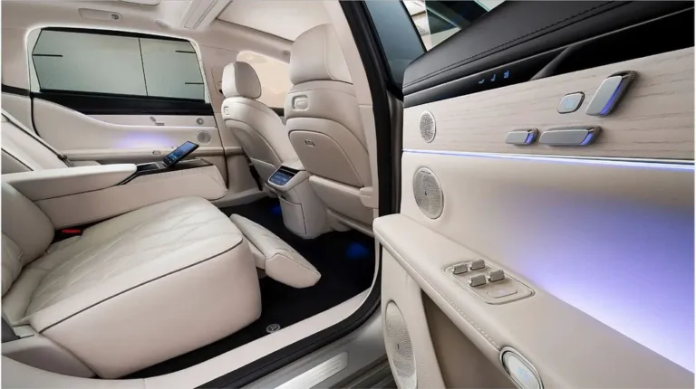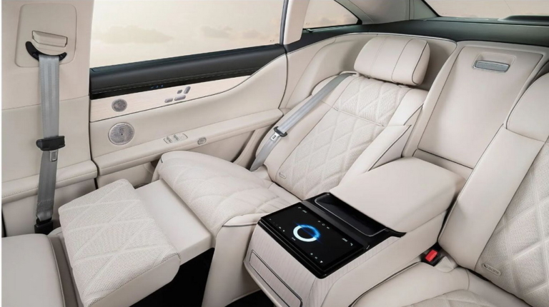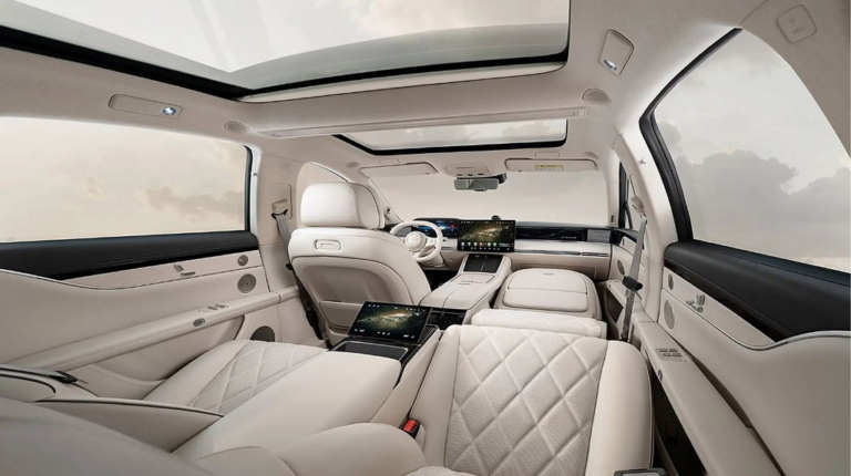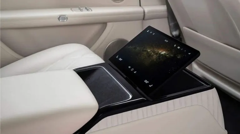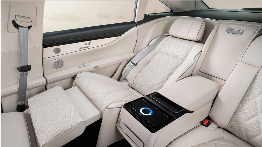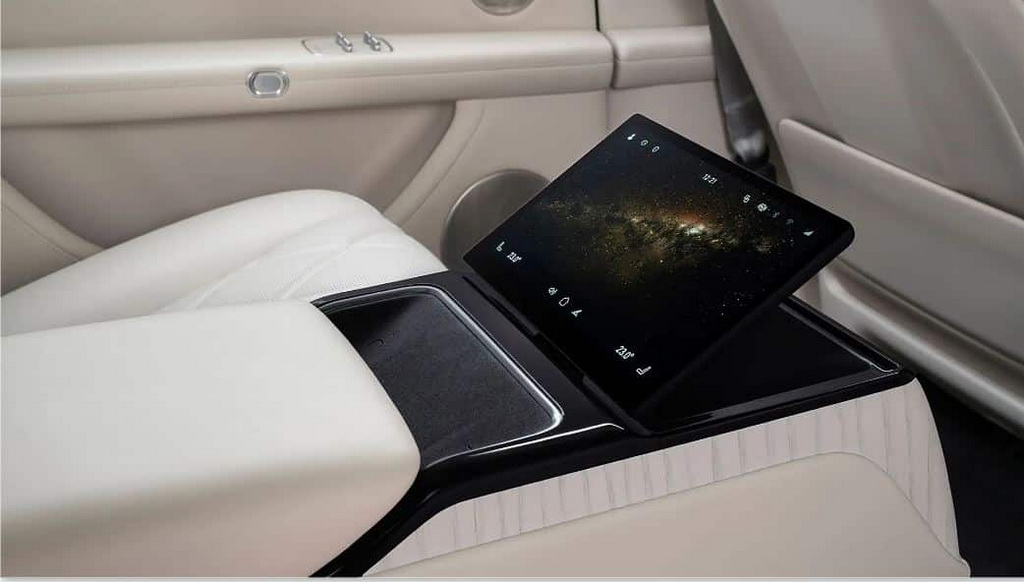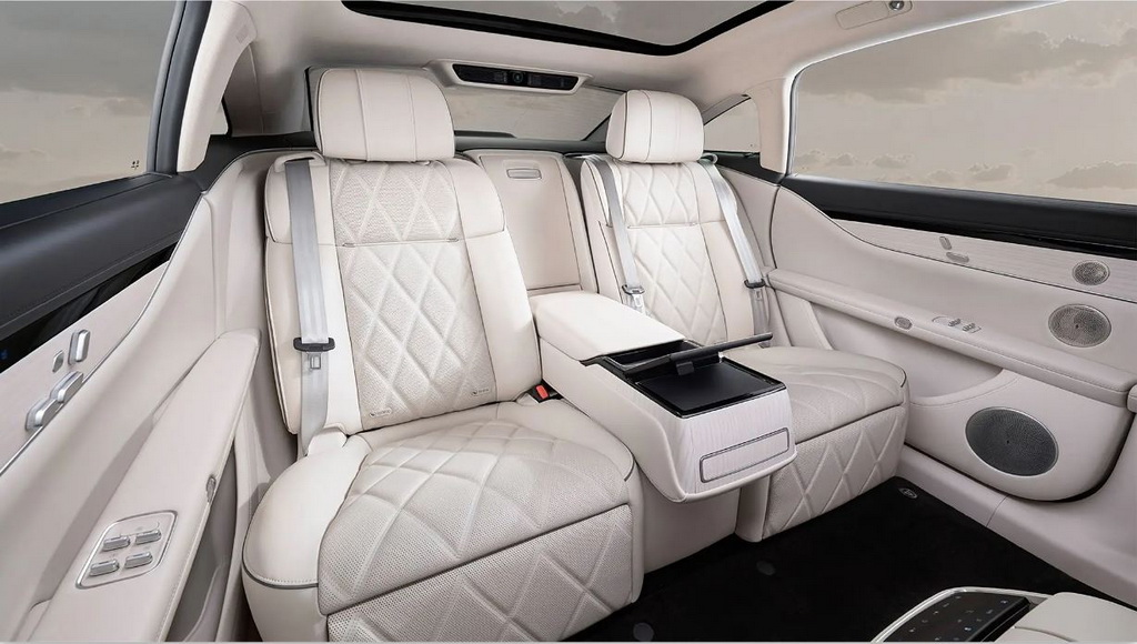 Сзади расположены два индивидуальных кресла повышенного комфорта с многочисленными регулировками и подколенными подушками, а между ними находится панель с сенсорным дисплеем для управления мультимедийной системой, а также отделение для беспроводжной зарядки смартфонов. Спинку переднего пассажирского сидения можно сложить, что позволит превратить заднее креслом в удобное спальное место.