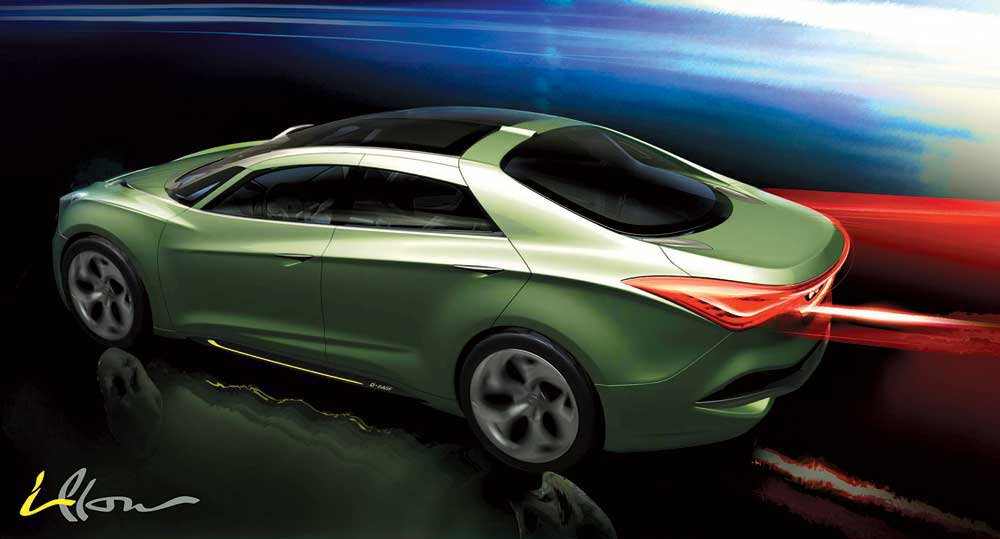 В ближайшем будущем у Hyundai появится новый седан европейского D-класса. О его облике можно судить по концепту i-flow, который станет одним из главных шоу-стопперов стенда компании в Женеве. Концепт оснащен гибридным дизель-электрическим силовым агрегатом Hyundai, включающим 1,7-литровый турбированный двигатель, электромотор, литий-полимерный аккумулятор и 6-ступенчатую коробку передач с двумя сцеплениями. Снизить расход топлива до 3,0 л/100 км, а также сократить выбросы CO2 до 85 г/км помогает также низкий (Сх 0,25) коэффициент лобового сопротивления. В стеклянные панели крыши встроены солнечные батареи, обеспечивающие питание для бортовых систем. Необычное покрытие кузова, разработанное специалистами BASF, усиливает визуальное впечатление от внешнего вида i-flow. Особые пигменты в этом экологичном покрытии на водной основе придают поверхности вид полированного металла и подчеркивают элегантные формы автомобиля.