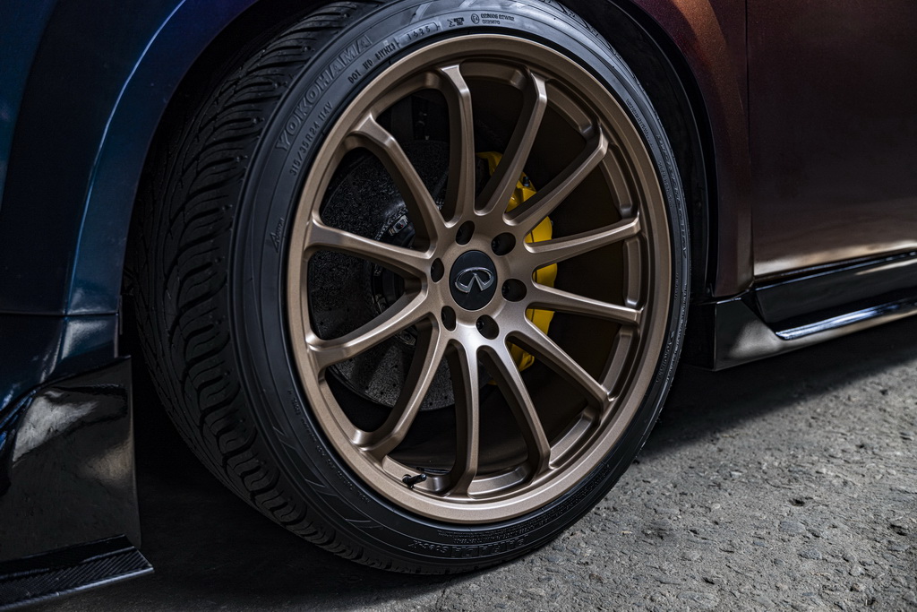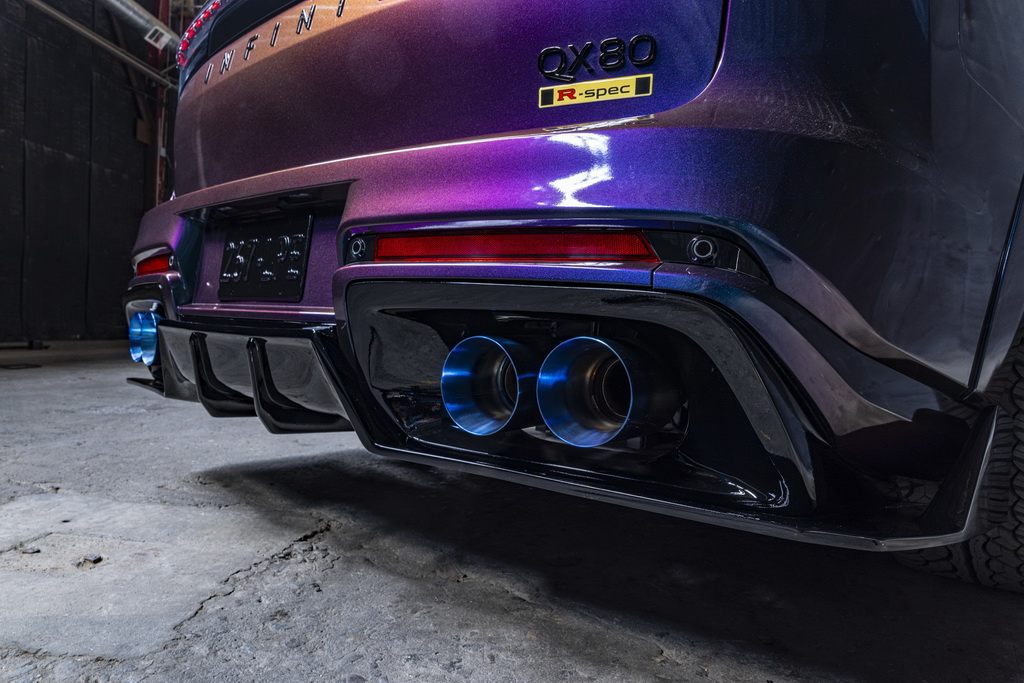 Справиться с мощной машиной помогут карбон-керамические тормоза Nissan GT-R, специально модифицированными для QX80, а регулируемая подвеска с койловерами MCS и амортизаторами Eibach ERS призвана обеспечить управляемость и комфорт. R-Spec оснащен гигантскими 24-дюймовыми дисками бронзового цвета, разработанными по образцу дисков для GT-R. На них установили скоростные низкопрофильные шины Yokohama Parada Spec-X размерностью 315/35.